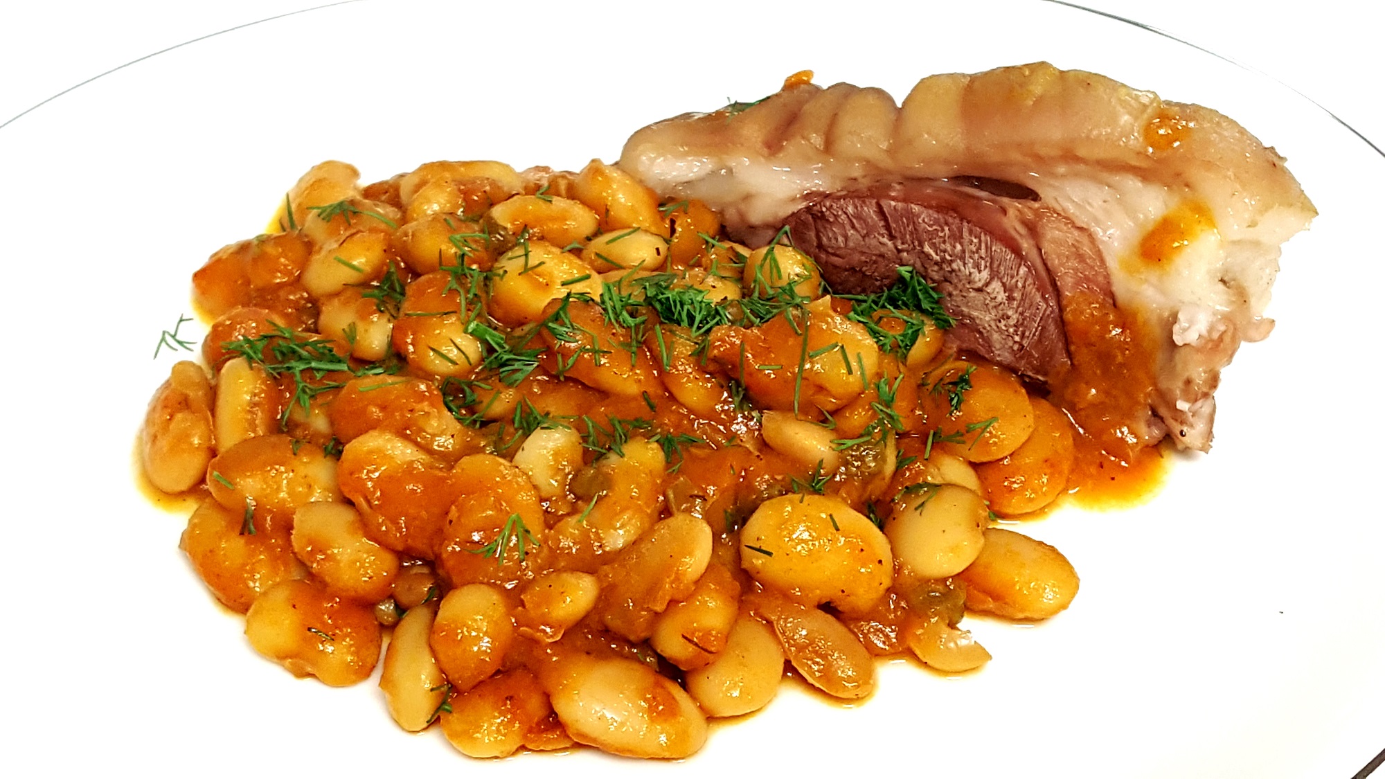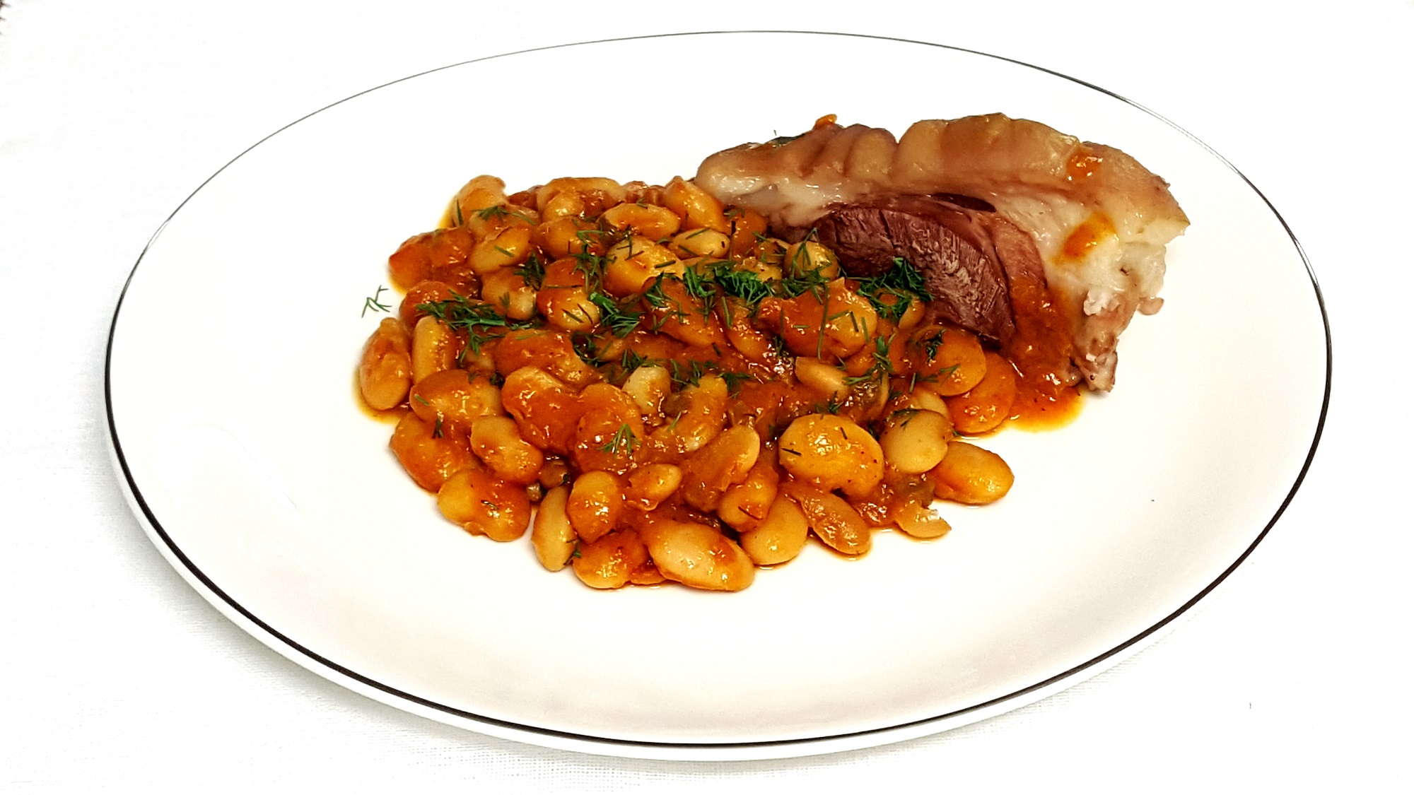 Ingrediente: fasole, ciolan de porc, bulion, ulei de floarea soarelui, ceapa, morcov, telina, ardei, marar, piper, sare, foi de dafin.